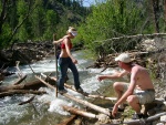 Crossing the river on our makeshift "bridge".